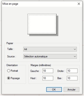 Ouvre une boîte de dialogue disponible dans laquelle vous pouvez définir les paramètres d’impression en fonction de l’imprimante installée.