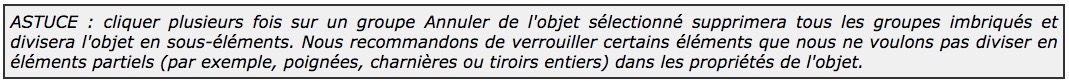 Divise le groupe créé par la commande précédente en sous-objets. Cliquer sur Désassembler sur l’objet groupé pour annuler le groupe. Les groupes imbriqués qui font partie d’un groupe supprimé restent intacts. L’étiquette ne change pas sa portée – tous les éléments restent sélectionnés. Un sous-groupe verrouillé dans les propriétés ne peut pas être divisé en sous-objets (groupes imbriqués) sans déverrouillage préalable, en savoir plus au chapitre 3.4.2. Création de groupes .