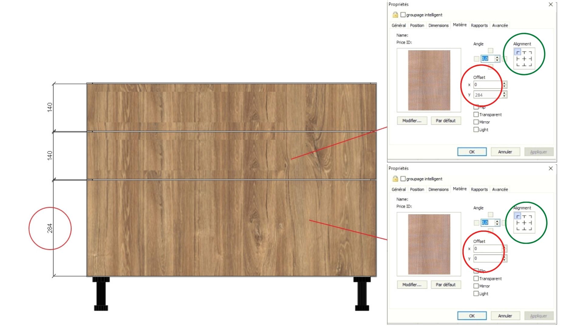 Offset détermine le décalage du rendu de la texture en millimètres sur les axes x et y. Dans l’exemple de l’image ci-dessus, on peut voir que la deuxième face a un décalage fixé par la valeur de la hauteur de la face inférieure. Cela signifie que la texture de la deuxième porte sera dessinée jusqu’à 284 mm du bord inférieur (Position). La face supérieure a alors un décalage défini sur l’axe des y de la valeur de la hauteur de la face inférieure + médiane (284 + 140 = 424 mm). Encore une fois, notez la même position de rendu de texture pour toutes les faces.