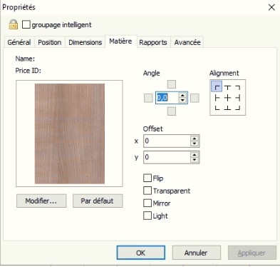 Le bouton Par défaut supprime le matériau de l’objet. L’élément aura une matière standarde par défaut.