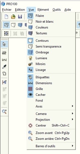 Ce menu contient des commandes relatives aux modes, méthodes et effets d’affichage et d’édition d’un projet. Nous utiliserons le terme mode d’affichage pour désigner les options d’affichage indépendantes du projet. On y trouve ce que nous pouvons activer ou désactiver dans un mode d’affichage donné. Un exemple de mode est, par exemple, Semi-Transparence. Les effets sont d’autres manières d’afficher un projet. Des effets de visualisation plus avancés sont disponibles lorsque l’affichage photoréaliste est activé dans la fenêtre Éclairage, plus en détail au chapitre 4.5.8. Éclairage.