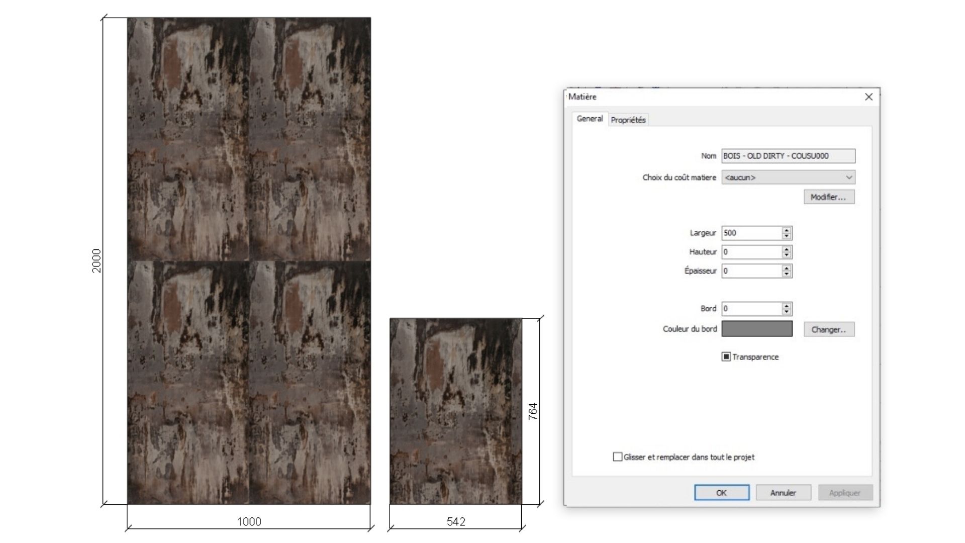 - Répétable – matériaux qui ont une répétabilité clairement définie – la taille de la structure (anneaux annuels, dessins ou motif). Ces matériaux comprennent, par exemple, des motifs en bois, des carreaux, des pavés, des textures de pierre, des motifs de papier peint, etc. Les valeurs de largeur et de hauteur dans ce cas indiqueront la dimension de dessin du matériau appliqué à l’objet dans le projet. Par exemple, un dessin d’une texture de bois avec une répétabilité fixée à 500 x 1000 millimètres sera répété 4 fois sur des flans mesurant 1000 x 2000 (2 fois en abscisse et 2 fois en ordonnée). L’emplacement exact du dessin sur l’ébauche peut être défini dans les propriétés des ébauches (objet) sur l’onglet Matière 4.3.2.4. Matière.