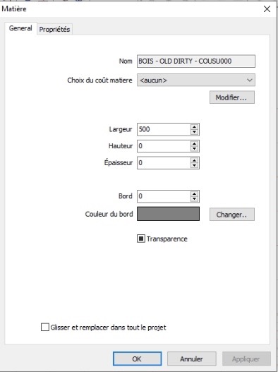Le dernier champ de la fenêtre Propriétés du matériau est Appliquer la modification à tous les objets du projet . En cochant ce champ, nous attribuons au matériau donné le mode de changement de couleur de tous les flans issus du même matériau. Mode glisser la touche Shift, chapitre 4.5.3. Bibliothèque de matériaux , mais sans avoir besoin d’utiliser la touche Shift. Le marquage de ce champ s’applique uniquement au changement de couleur lors du déplacement du matériau avec la souris.