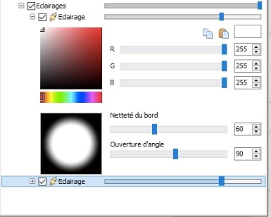 ATTENTION 2– si vous faites glisser une texture (matériau), comme une couleur homogène, sur un objet qui est clair, les curseurs RVB peuvent se comporter de manière non intuitive (par exemple, nous avons fait glisser une texture qui est rouge – et nous avons oublié ou le l’objet est trop petit pour le rendre facilement visible – nous déplaçons les curseurs RVB vers le vert, par exemple, et la lumière résultante sort en jaune). Pour la version 5 et supérieure, nous vous recommandons d’utiliser uniquement le curseur RVB lors de l’utilisation de lumières aux couleurs homogènes (et de laisser la texture de l’objet comme “par défaut”); dans le cas des lumières “projecteur” – laissez le curseur RVB sur blanc (tous aussi loin à droite que possible) et utilisez des matériaux en faisant glisser de la bibliothèque pour créer une “image” projetée par le “projecteur”.