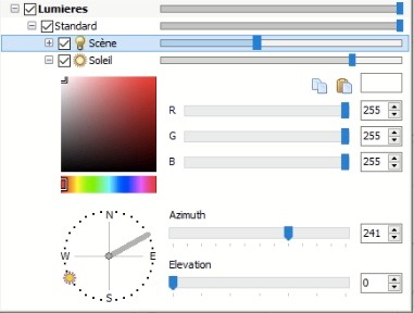 Couleur – la possibilité de définir la couleur de la lumière du soleil à l’aide de curseurs en mode RVB, des cases pour saisir manuellement la valeur d’intensité de la couleur, prévisualiser la couleur sélectionnée.