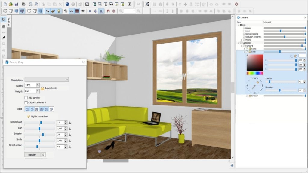 L’intensité de la lumière du soleil est transférée du réglage approprié dans la fenêtre Éclairage de PRO100, mais nous pouvons également la corriger à l’aide du curseur de la fenêtre d’interface d’exportation vers le rendu KRAY.