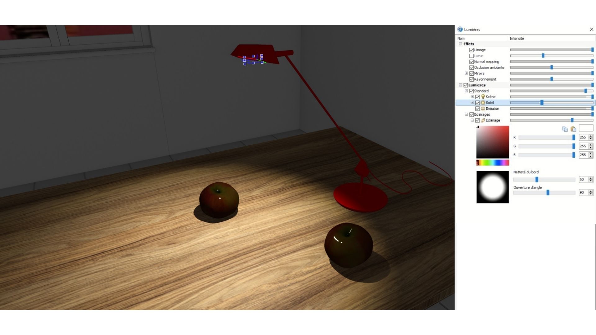 La lumière halogène est une source de lumière directionnelle, c’est-à-dire qu’elle éclaire dans une direction, et nous le savons bien dans PRO100. Un halogène est un objet auquel cette propriété est affectée dans les propriétés de l’ objet sous l’onglet Matériau . Les paramètres des lampes halogènes peuvent être ajustés dans la fenêtre Eclairage (Outils > Eclairage) dans la section Halogènes . Toutes les valeurs telles que l’intensité, la couleur et la taille du cône de lumière sont exportées vers KRAY et interprétées en fonction des paramètres de la fenêtre Éclairage.