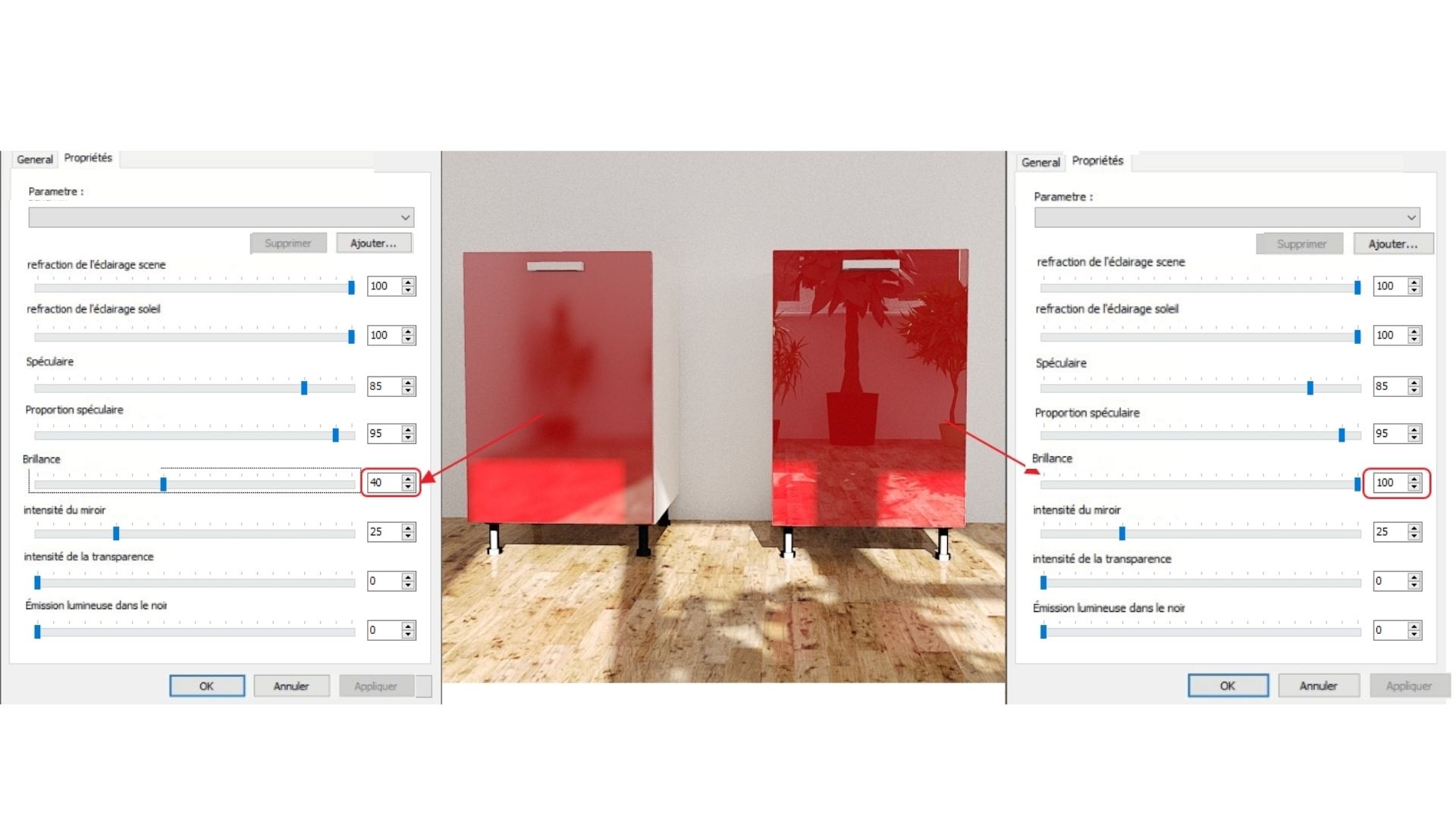 RECOMMANDATION : Des propriétés de matériau correctement définies dans la bibliothèque de matériaux sont très importantes pour un bon résultat. Utilisez des matériaux clonés (clic droit sur un matériau dans la bibliothèque > Cloner …) avec différentes propriétés de surface. Par exemple, plusieurs variations de couleur grise avec différentes valeurs de propriétés de surface – telles que métal brillant, miroir, métal mat, etc. Expérimentez !