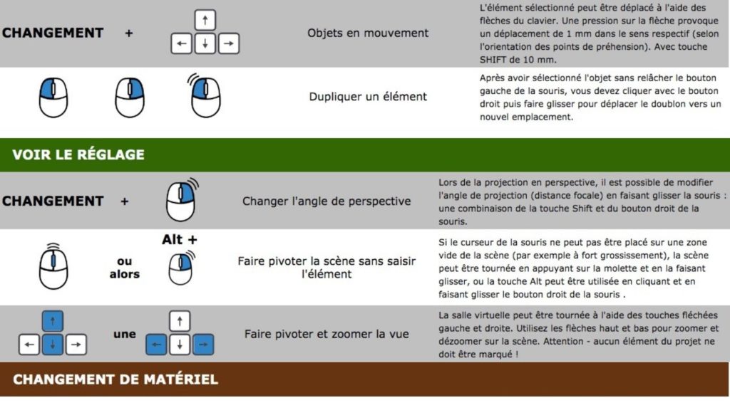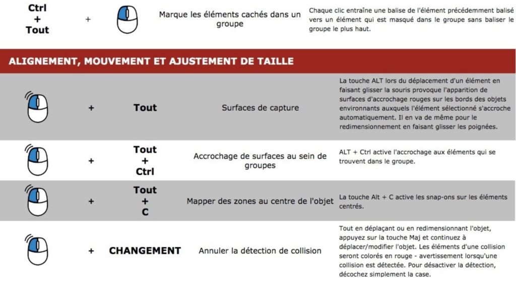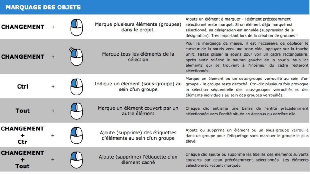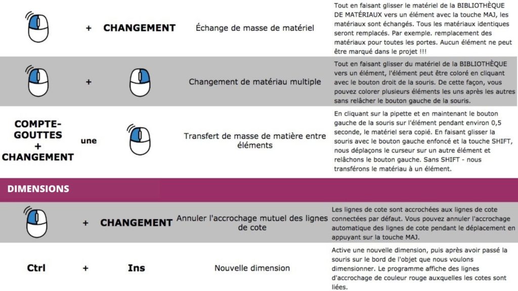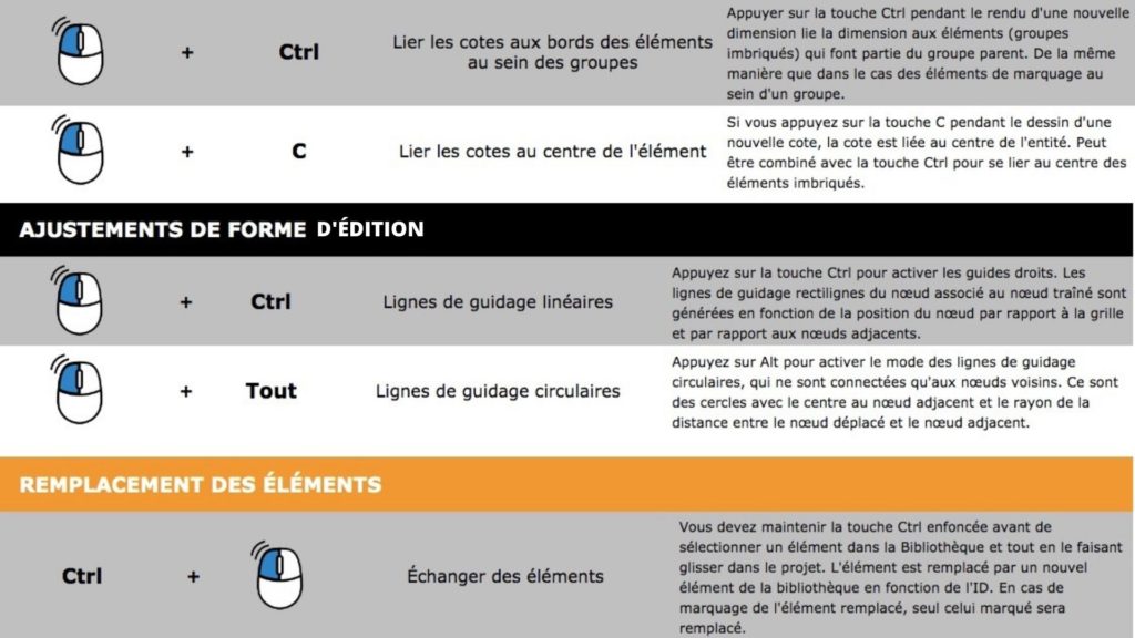 Dans ce chapitre, vous trouverez la plupart des raccourcis clavier disponibles et des façons de travailler avec la souris. Les touches les plus couramment utilisées sont MAJ, Ctrl et Alt en conjonction avec le bouton gauche de la souris. Ces raccourcis ont des fonctions différentes selon l’état actuel du programme, les paramètres et la façon dont vous travaillez dans le programme.