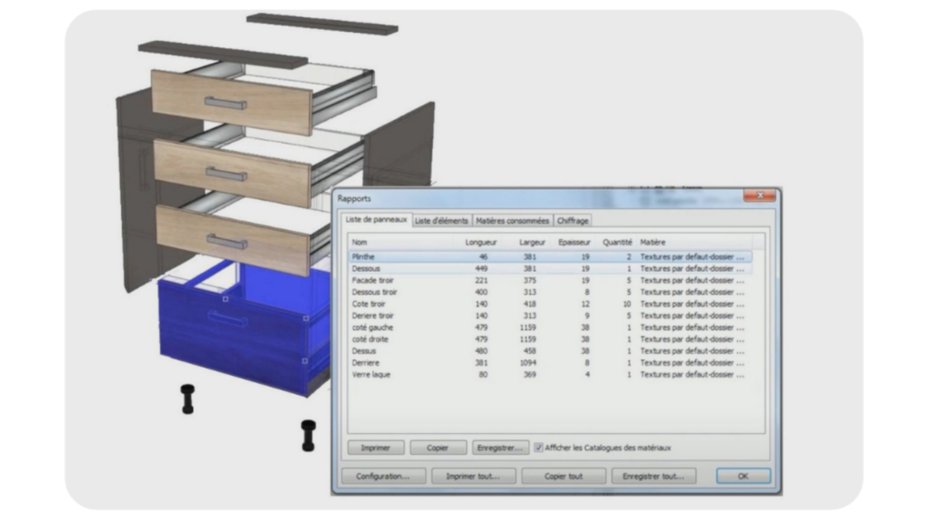 Désassemblez les meubles et visualisez précisément leurs constitutions. Obtenez également un rapport clair et précis des différents éléments le constituant, de leurs dimensions, du débit de matière consommée ainsi que du chiffrage de ces éléments.